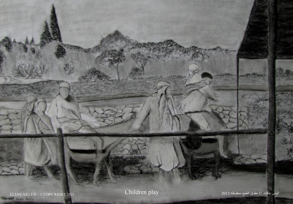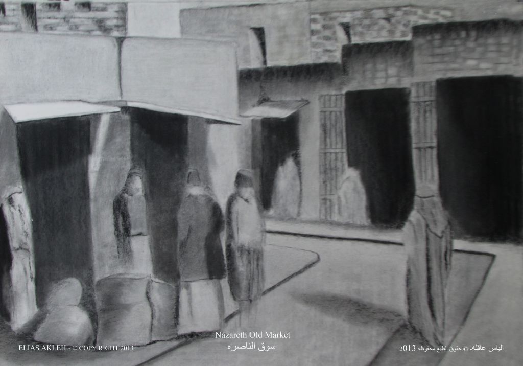 In the series “palettes from memory” the artist displays a charcoal on paper Palettes which had taken and inspired from social life, still life and figures from Nazareth city.